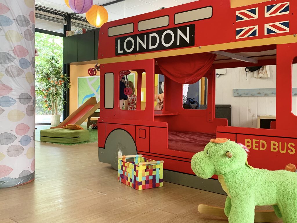 Amb menjador i cuina, un lavabo a la seva mida on aprenen a rentar-se i a ser autònoms en el seu dia a dia i amb tot d’elements psicomotrius com el tobogan, el bus, el puf, els matalassos i tots aquells racons actius que ells mateixos es construeixen en aquest espai que és viu i on cada dia «parem la taula» per jugar i viure feliçment la nostra jornada a l’escoleta de vida.