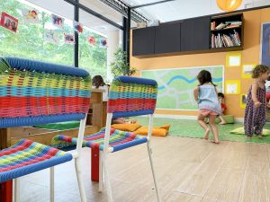 És un espai ple de joc per als nens i nenes d’1 a 6 anys, amb diferents racons, entre d’altres, de pissarra, de construcció i rodes, de nines i ninus, de lectura, de manualitats i jocs de taula, de nadons, de disfresses (joc simbòlic) i de natura (estacions), entre d’altres, on la llum natural brilla arreu perquè hi juguin pel seu compte o amb la companyia dels pares o companys i companyes.